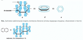3) соответствие правилу Э. Хюккеля, т.е. электронное облако должно насчитывать 4n+2 π-электронов, где n=1,2,3,4… (обычно цифра указывает на количество циклов в молекуле);