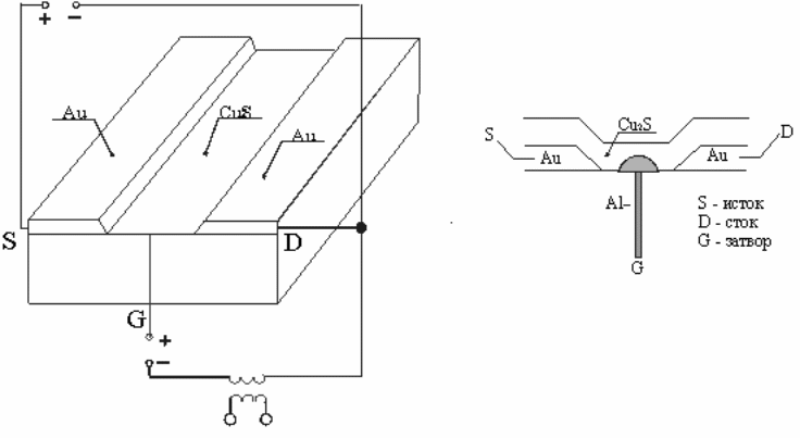 - управляющий электрод (затвор); 2 - тонкий слой полупроводника(теллур, йод, окись меди, пятиокись ванадия; 3 (сток); 4 (исток) - омические контакты к полупроводнику; 5 - источник постоянного тока; 6 - источник переменного напряжения; 7 - амперметр.