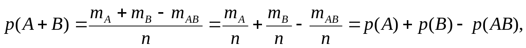 Назовем все возможные результаты данного опыта его исходами и предположим, что множество этих исходов, при которых происходит событие А (исходов, благоприятных событию А), можно представить в виде некоторой области на плоскости. Тогда множество исходов, при которых произойдет событие А+В, является объединением множеств исходов, благоприятных событиям А или В