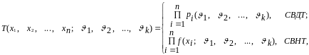 где pi(1, 2, ..., k) = P{Xi = xi} - вероятность того, что СВДТ Xi примет значение xi; f(x; 1, 2, ..., k) - плотность распределения СВНТ X. Функция T(x1, x 2, ..., x k; 1, 2, ..., k) показывает, на сколько правдоподобны значения СВ X, полученные в выборке объема n при некоторых параметрах 1, 2, ..., k. Если 1, 2, ..., k - истинные значения, то, очевидно, что T(x1, x 2, ..., x k; 1, 2, ..., k) > T(x1, x 2, ..., x k; 1, 2, ..., k), где 1, 2, ..., k - значения отличные от истинных. Следовательно в качестве оценок 1, 2, ..., k неизвестных параметров выбирают такие, при которых функция правдоподобия принимает максимальное значение, т.е. T(x1, x 2, ..., x k; 1, 2, ..., k) = max. Тогда решение следующей системы из k уравнений позволяет получить оценки 1, 2, ..., k неизвестных параметров