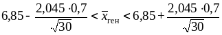 Пример 8. С целью определения средней продолжительности рабочего дня на предприятии методом случайной повторной выборки проведено обследование продолжительности рабочего дня сотрудников. Из всего коллектива завода случайным образом выбрано 30 сотрудников. Данные табельного учета о продолжительности рабочего дня этих сотрудников и составили выборку. Средняя по выборке продолжительность рабочего дня оказалась равной 6,85 часа, а S = 0,7 часа. Считая, что продолжительность рабочего дня имеет нормальный закон распределения, с надежностью = 0,95 определить, в каких пределах находится действительная средняя продолжительность рабочего дня для всего коллектива данного предприятия.