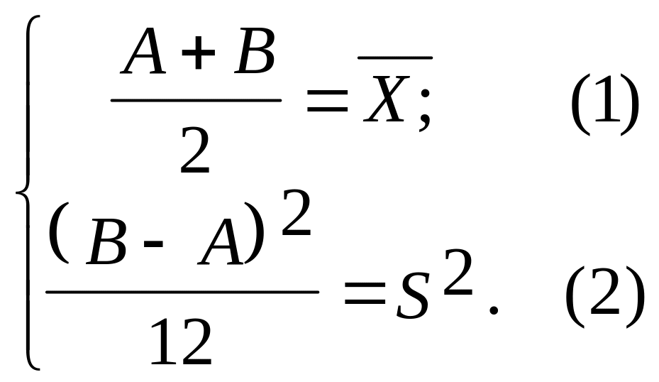 Согласно этому методу нужно вычислить два момента (начальный 1-го порядка и центральный 2-го порядка) СВ X: mX = (a+b)/2 и DX = (b-a)2/12 и составить два уравнения (1) и (2), приравнивая моменты (A+B)/2 и (B-A)2/12 к их соответствующим выборочным значениям