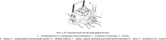 Для намагничивания деталей могут применяться стационарные установки и переносные магнитные дефектоскопы. На стационарных установках детали зажимаются между контактными пластинами головок, перемещаемых по станине. Путем перестановки детали могут быть намагничены в различных направлениях, что позволяет надежно выявить трещины любой ориентации. С помощью переносных магнитных дефектоскопов можно контролировать небольшие детали, не снимая их с самолета в аэродромных условиях. При этом намагничивание может производиться с помощью катушки, магнитов или кабеля (рис.5.19.).
