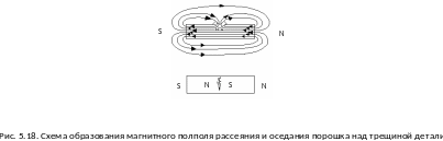 Магнитный метод основан на использовании явления возникновения на поверхностях намагниченной детали в местах расположения дефектов магнитных полей рассеяния. Магнитные силовые линии при наличии дефекта искривляются, при этом часть их выходит на поверхность детали, образуя по краям дефектного участка дополнительные полюса со своим магнитным полем. Для обнаружения этих полей на поверхность детали наносится магнитная суспензия или сухой ферромагнитный порошок. Частицы порошка притягиваются магнитным полем рассеяния, в результате чего в местах, где имеются дефекты, образуются полоски из осевшего порошка, определяющие границы дефектов. На сплошной поверхности магнитный порошок не задерживается (рис. 518.).