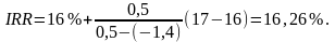 Можно уточнить полученное значение путем определения NPV для ставок дисконта R, выраженных целыми числами и ближайших к расчетной IRR: для R = 16% имеем NPV = +0,5; для R = 17% получим NPV = -1,4. Тогда уточненное значение IRR будет равно: