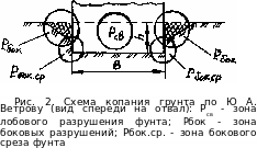 соответственно разрушению грунта в трех основных зонах (рис. 2). Сипы для преодоления лобовых сопротивлений ножу Рсв пропорциональны площади лобовой поверхности ножа и ширине резания b и зависят от угла резания и прочности фунта. Силы разрушения грунта в боковых расширениях Рбок пропорциональны площади этих боковых расширений и зависят от прочности фунта. Силы бокового среза фунта Рбок.ср. пропорциональны глубине резания и прочности грунта. Данная теория показывает наиболее близкие к практическим значениям результаты вычислений для случая разрушения плоскими ножами прочных и мерзлых фунтов при относительно небольшой ширине резания b и значительной глубине h разрушения грунта. При расчетах необходимо отдельно учитывать сопротивление от износа режущей кромки, усилие перемещения призмы волочения и т.п.