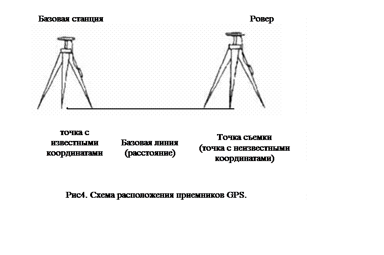 При разбивки планово – высотного обоснования устройством ProMark3 базовая станция приемника размещается на точке с известными координатами (пункты ГГС, полигонометрии, триангуляции), а второй приемник, ровер, размещается на точке координаты которой необходимо вычислить. Оба приемника работают в режиме статической съемки (рис 4. Cхема расположения приемников GPS)