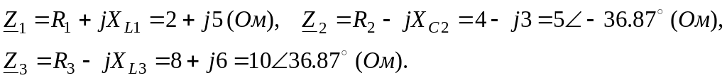 9. В чотирипровідному трифазному колі при діючих значеннях фазних напруг UФ=220 В навантаження ввімкнуто зіркою. Опори фаз споживачів в комплексній формі рівні