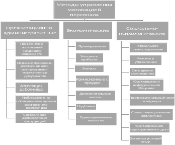 Методы мотивации труда аналогичны методам, используемым в управлении персоналом вообще. Среди них есть общие, широко применяемые в управлении другими объектами (производством, народным хозяйством в целом): административные, экономические, социальные и большое количество конкретных частных методов. Управление персоналом и, в частности, мотивацией труда должно основываться на принципах системного подхода и анализа, что означает охват всего кадрового состава предприятия, увязку конкретных решений в пределах подсистемы с учетом влияния их на всю систему в целом, анализ и принятие решений в отношении персонала с учетом факторов внешней и внутренней среды во всей полноте взаимосвязей.