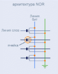 Назва NOR веде свій родовід від логічної операції Not OR (не "або"): якщо хоча б один з транзисторів, підключених до лінії бітів, включений, то зчитується "0". NOR-ОR осередки працюють подібним з EPROM способом. Кожен транзистор-осередок підключений до трьох ліній: Word Line (лінія слів), Select Line (лінія вибірки) і Bit Line (лінія біт). Вибірка здійснюється шляхом подачі високої напруги на Word Line, підключену до затвору, і спостереження за різницею потенціалів між Select Line (джерело) і Bit Line (стік). Якщо на плаваючому затворі знаходилася достатня кількість електронів, то їх негативне поле перешкоджало протіканню струму між витоком і стоком, і напруга залишалася високою. Такий стан покладається в термінах флеш-пам'яті нулем, в протилежному випадку зчитується одиниця.
