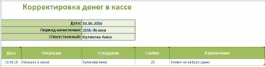 Поле «Сумма» содержит отклонение. Если мы проводим недостачу в кассе, то сумму ставим со знаком «минус», если излишек в кассе, то сумму ставим со знаком «плюс»;