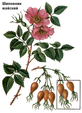 Шиповник майский - Rosa majalis Herrn. (коричный - Rosa cinnamomea L). Стебель высотой 1-2 м, шипы, загнутые вниз. Цветки розово-пурпурные. Плоды овальные, оранжево-красные, с чашелистиками, направленными вверх. Высоковитаминный вид: 4-14% аскорбиновой кислоты.