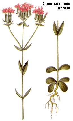 Ботаническая характеристика. Золототысячник малый - двухлетнее или однолетнее голое травянистое растение. Корень стержневой, разветвленный, слабый. Стебли одиночные или в числе 2-5 из одного основания, четерехгранные, высотой до 35-40 см, вильчато-ветвистые с веточками, направленными вверх. Стеблевые листья супротивные, сидячие, продолговато-ланцетовидные с хорошо заметными жилками; прикорневые листья собраны в розетку, обратно-яйцевидные, с 5 жилками. Соцветие зонтиковидно-метельчатое, сжатое, с прицветниками. Цветки пятираздельные, сидячие, темно-розовые, венчик гвоздевидный. Плоды - многосеменные, узкие коробочки. Семена мелкие, круглые, сетчато-ямчатые. Цветет в июне - августе. Плоды созревают в августе. В первый год развивается только розетка листьев. Допускается к заготовке золототысячник красивый. Это однолетнее травянистое растение высотой 5-20 см, похоже на золототысячник малый, но без розетки прикорневых листьев, с ветвистым от основания стеблем и более темными, красновато-розовыми цветками.