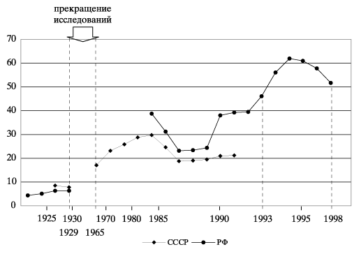 Таким образом, официальные статистические данные свидетельствуют о заметной социальной окраске феномена самоубийства в СССР и России. Рост уровня самоубийств был связан с активизацией репрессий в 1937 и 1947 гг.; со стагнацией советского общества в период с середины 1960-х гг. до 1984 г.; с разочарованием в «перестройке» и результатах реформ 1990-х гг.