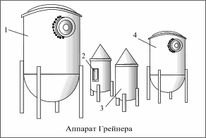 воздуха в о Разведение чистой культуры происходит следующим образом. В стерилизатор 4 из сусловарочного котла набирают горячее охмеленное сусло, кипятят его в течении 1 ч, затем охлаждают до8-12оС. С помощью сжатого стерильного воздуха сусло подают в цилиндр 3, куда через специальный кран из медной колбы Карлсберга вводят чистую культуру, затем сбраживают в течении 3 сут. При этом дрожжи размножаются и увеличиваются в массе. к концу третьих суток резервуар предварительного брожения заполняют суслом, которое также нагревают до кипения, а затем охлаждают. Часть чистой культуры из бродильного цилиндра 3 отбирают на хранение в сосуд 2 для посевных дрожжей, где она хранится до до следующей разводки, а основную часть его перекачивают в резервуар 1, где осуществляют предварительное брожение при 9оС в течение 3 сут. В следующих циклах разведения дрожжи для посева в стерильное сусло, находящееся в бродильном цилиндре 3 берут из сосуда 2. Процесс разведения чистой культуры в установке Грейнера повторяют многократно до обнаружения в дрожжах посторонней микрофлоры. Сбраживаемую массу из резервуара 1 перекачивают в специальный аппарат для предварительного брожения вместимостью 1000 дал, но наполненный на 1/3 суслом температурой 5-7оС. Через 12 ч брожения в этот аппарат доливают еще 400 дал свежего охмеленного сусла и продолжают брожение еще 36 ч, поддерживая температуру 5-7С. Затем сбраживаемое сусло перекачивают в аппарат для главного брожения с 700 дал сусла , а через 1 сут заполняют его суслом до полной вместимости и ведут брожение обычным способом, контролируя температуру, концентрацию сусла и осветление. Осевшие при брожении дрожжи смывают, промывают холодной водой и используют в производстве как первую генерацию. Дрожжерастительные аппараты перед началом работы стерилизуют паром в течение 45 мин под давлением 0,15- 0,17 МПа. Воздух, поступающий в стерилизатор, должен проходить через воздушные фильтры.