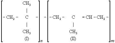 Синтетический каучук, продукт сополимеризации изобутилена (I)и небольшого количества (1—5%) изопрена (II) общей формулы: