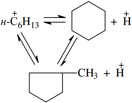 Наряду с распадом С-С связи является важной целевой реакцией, повышает товарные качества продуктов. В большинстве случаев изомеризация протекает быстрее, чем крекинг. Изомеризация может происходить либо путем передачи протона, либо метильной группы вдоль УВ цепи.