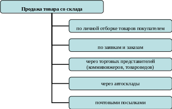 На рисунке 1.5 представлены основные формы продажи товаров при использовании метода продажи товаров со склада. Данными формами являются продажи по личной отборке товаров покупателем, по заявкам и заказам, через торговых представителей (коммивояжеров, товароведов), через автосклады, с помощью почтовых посылок.
