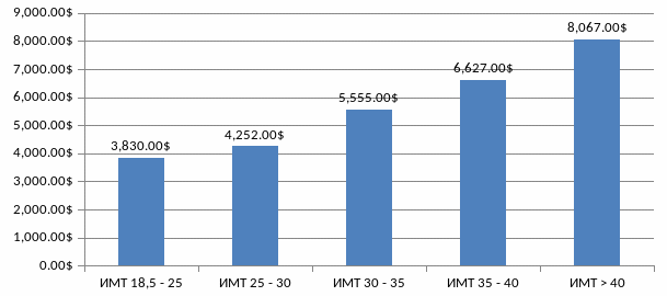 Исследование основано на данных 2011 года. Были рассчитаны среднегодовые затраты работодателей на каждого работника, страдающего ожирением. Показатели представлены на рисунке 4, на основании которого можно сделать вывод о том, что затраты на работника растут с уровнем его ИМТ. На работников, принадлежащих к третьей группе ожирения в год тратится более, чем в два раза, больше, чем на работников с нормальным ИМТ. Эти затраты включают в себя медицинские расходы, выплаты больничных, отсутствие на рабочем месте по причине болезни и прочие статьи, которые будут описаны далее более подробно.