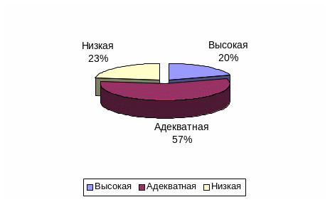 По графику видно, что дети с высокой самооценкой успешны в учебной деятельности они составляет 20% от общего количества учащихся. С адекватной – 57%, с низкой – 23% учащихся.