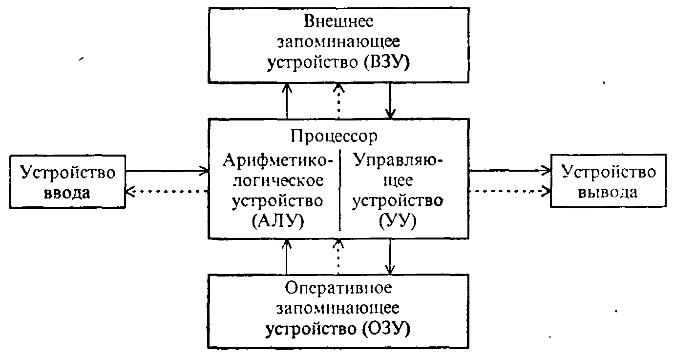 Основными блоками по Нейману являются устройство управления (УУ) и арифметико-логическое устройство (АЛУ) (обычно объединяемые в центральный процессор), память, внешняя память, устройства ввода и вывода. Следует отметить, что внешняя память отличается от устройств ввода и вывода тем, что данные в нее заносятся в виде, удобном компьютеру, но недоступном для непосредственного восприятия человеком. Так, накопитель на магнитных дисках относится к внешней памяти, а клавиатура – устройство ввода, дисплей и печать – устройства вывода.