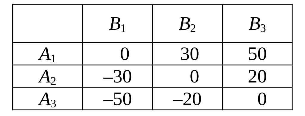 где aij – количество покупателей товара фирмы А в процентах, на которое оно увеличивается, если фирма А применяет стратегию Аi , а фирма В – стратегию Вj.