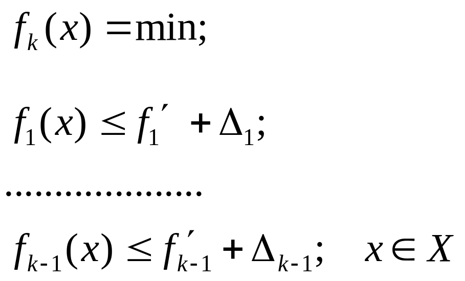 Пусть среди частных критериев fi(x), критерий f1(x) является доминирующим (рассматриваем случай, когда все критерии подлежат минимизации). Тогда многокритериальную задачу сводят к однокритериальной: