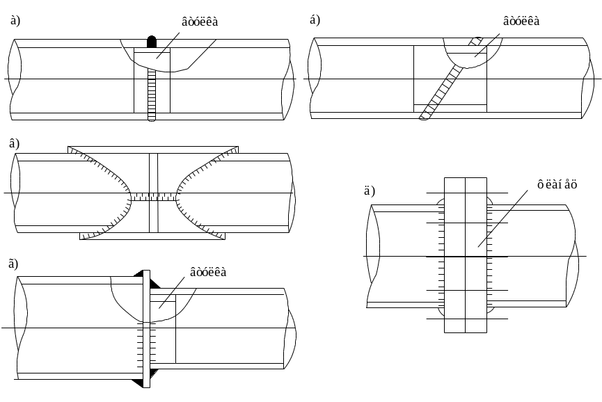 а – с непосредственным примыканием; б – со сплющиванием концов стержней; в – на фасонках; г – со вставками.