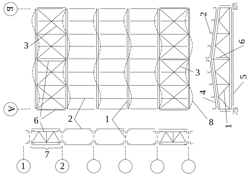 1 – ферма; 2 – прогоны; 3 – горизонтальные связи; 4 - горизонтальные связи по верхним поясам ферм; 5 – горизонтальные связи по нижним поясам ферм; 6 – вертикальные связи; 7 – пространственный блок (связевый блок); 8 – возможная форма потери устойчивости верхнего пояса фермы.