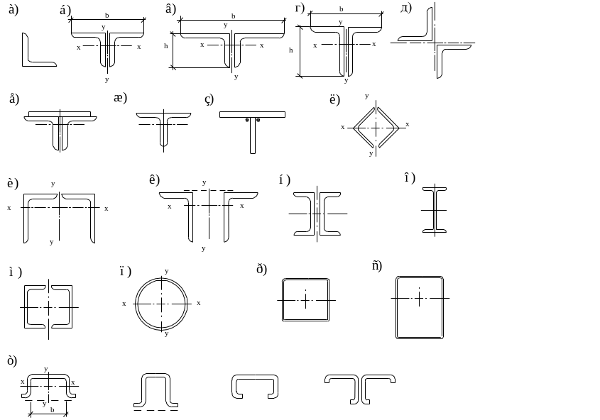 а, б, в, г, д, е, ж, з, и, к, н, о, т – открытого типа; л, м, н, п, р, с - замкнутого сечения; а, б, в, г, д, ж, и, к, л, м, н, о – прокатные профили; т – гнутые профили; а – одиночный уголок; б, в, г – тавровое сечение из двух уголков; д – крестовое сечение из двух уголков; п - электросварная труба; р, с – замкнутый гнутосварной профиль.