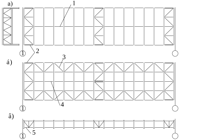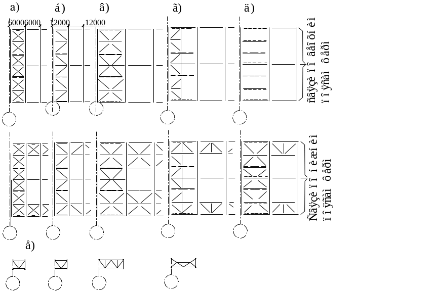 а – связевая ферма с крестовой решеткой; б – связевая ферма с треугольной решеткой; в – более жесткая система связей; е - возможные схемы вертикальных связей.