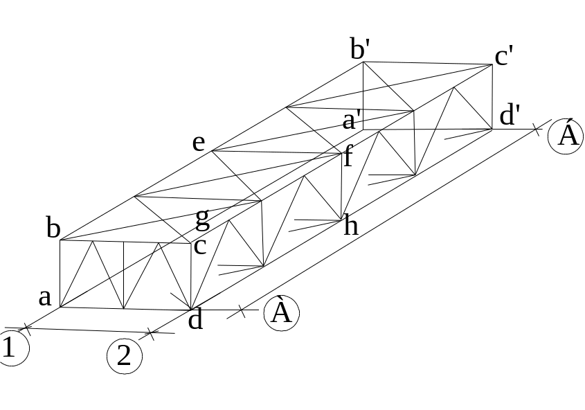 плоскости – abcd; a'b'c'd'; efgh– вертикальная связь между фермами, при короткой ферме вертикальные связи устанавливаются только по торцам.