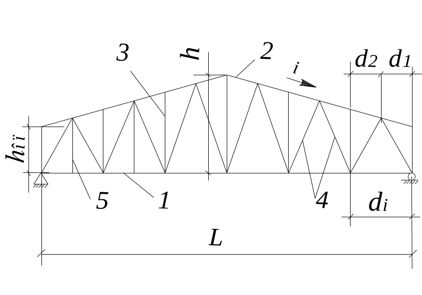 1 - нижний пояс; 2 - верхний пояс; 3 - стойки; 4 – раскосы; 5 - подвесы; hоп - высота на опоре; h - высота в пролете; L - расчетный пролет; i - уклон верхнего пояса; di: - длина панели нижнего пояса; d1,2 - длина панели верхнего пояса