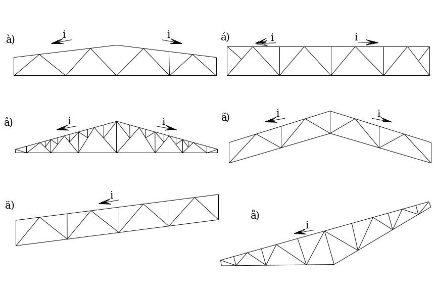 Схемы ферм для покрытий зданий имеют различные варианты (Рис.22). Выбор типа ферм зависит от конструктивной схемы здания, конструкции кровли, технико-экономических показателей и др. Эти требования определяют габариты фермы, очертание верхнего пояса, способ водоотвода, уклон кровли и т.д.