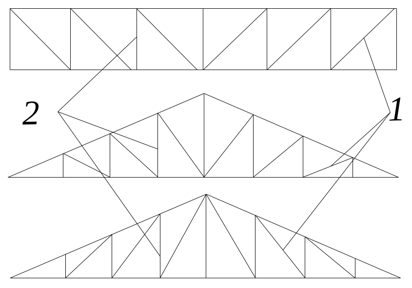 1 - длинные раскосы работают на растяжение, 2 - короткие стойки работают на сжатие.
