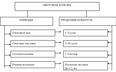 В нашей стране получила распространение следующая периодизация ожоговой болезни: ожоговый шок, острая токсемия, септикотоксемия, реконвалесценция (схема 2).