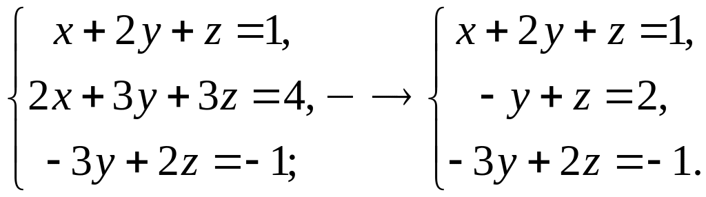 Решение. Преобразуем систему к треугольному виду. Для этого сначала исключим из второго и третьего уравнений системы переменную . Умножим первое уравнение системы на ( ) и сложим его с третьим уравнением системы. Получим: