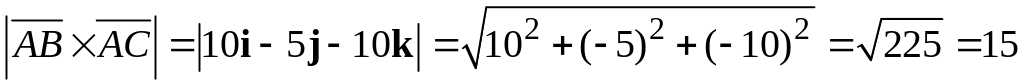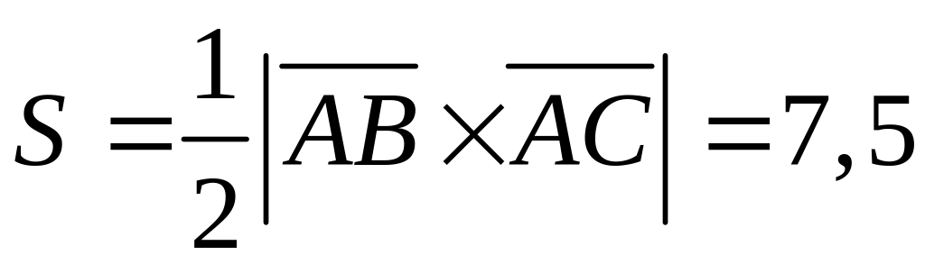 Площадь треугольника, построенного на двух векторах, равна половине модуля векторного произведения этих векторов. Найдем векторное произведение по формуле из раздела Справочный материал, Векторы на плоскости и в пространстве: