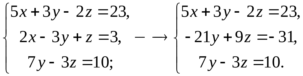 Пример 5. Решить систему трех уравнений с тремя неизвестными методом Гаусса