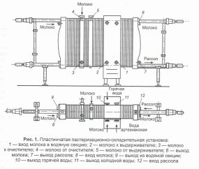 Наиболее распространены пластинчатые пастеризационно-охладительные установки, в которых молоко охлаждается в закрытом потоке. Они имеют высокую эффективность охлаждения, малый рабочий объем аппарата, что способствует быстрой реакции охлаждения (рис. 1).