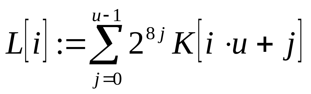 Перетворення ключа К в масив L. Нехай u=w/8 (кількість байтів у слові) і c=int[b/u] (довжина К в словах).