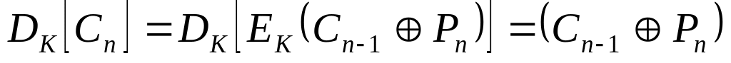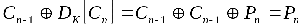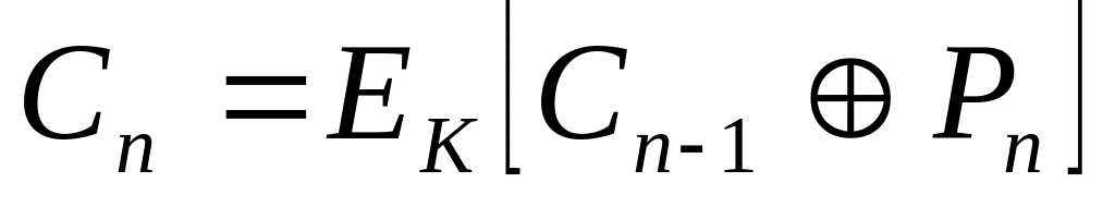 Тут EK і DK означає операцію шифрування (дешифрування) з ключем К, Ci та Pi – і-й блок шифрованого та відкритого тексту відповідно, а знак позначає операцію побітового виключного АБО (XOR).