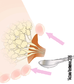Что при этом происходит: пальцы мягко и безболезненно отжимают излишний отек вглубь. На время ареола опять становится мягкой и эластичной, сосок — более выраженным, но главное — освобождается путь для молока — протоки. Малыш может присосаться — и может получать молоко.
