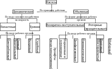 Насосом называется гидравлическая машина, предназначенная для преобразования механической работы привода в энергию давления перекачиваемой жидкости. Общая схема классификации насосов представлена на рис. 13.1.