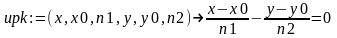 >upk:=(x,x0,n1,y,y0,n2)->(x-x0)/n1-(y-y0)/n2=0;