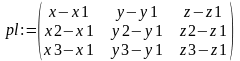 >pl:=matrix([[x-x1,y-y1,z-z1],[x2-x1,y2-y1,z2-z1],[x3-x1,y3-y1,z3-z1]]);