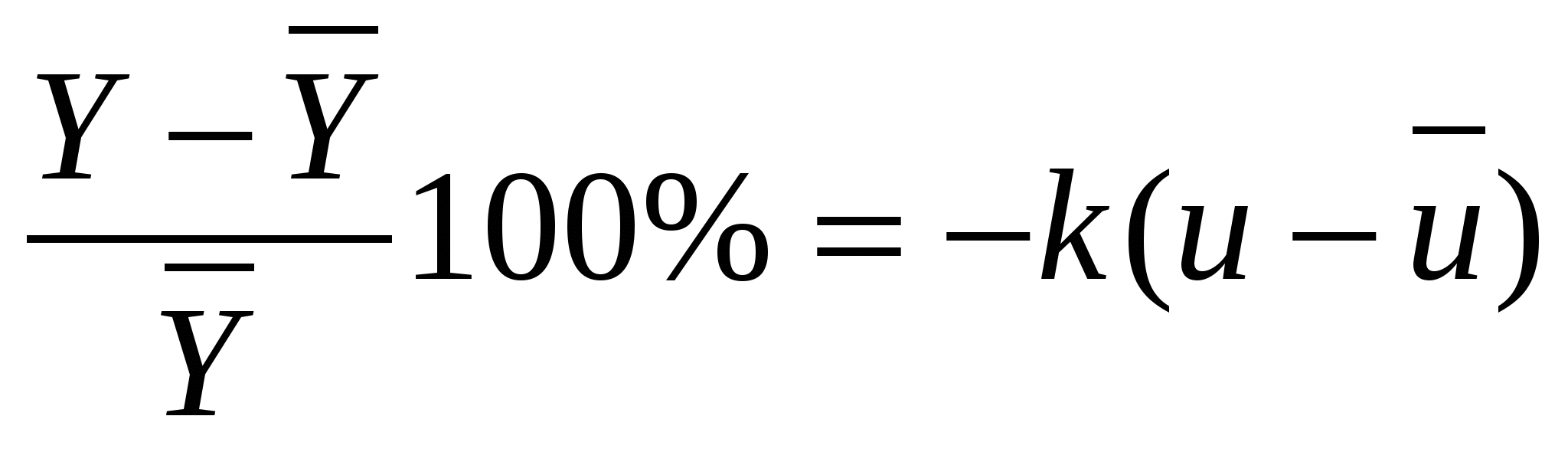 Левая часть приведенной формулы отражает отклонение (в %) фактического ВВП от его потенциального уровня, а ее правая часть – отклонение фактической безработицы от ее естественного уровня, помноженное на коэффициент чувствительности ВВП к изменению безработицы.