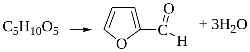 Ход исследования: В пробирку вносят щепотку древесных опилок или соломы, в которых содержатся полисахариды – пентозаны. Опилки или солому смачивают концентрированной соляной кислотой после чего добавляют несколько кристалликов флороглюцина. Появляется малиново-красное окрашивание. Пентозаны, содержащиеся в опилках и соломе, под влиянием соляной кислоты расщепляются до пентоз. Пентозы под действием соляной кислоты теряют воду и образуют фурфурал.