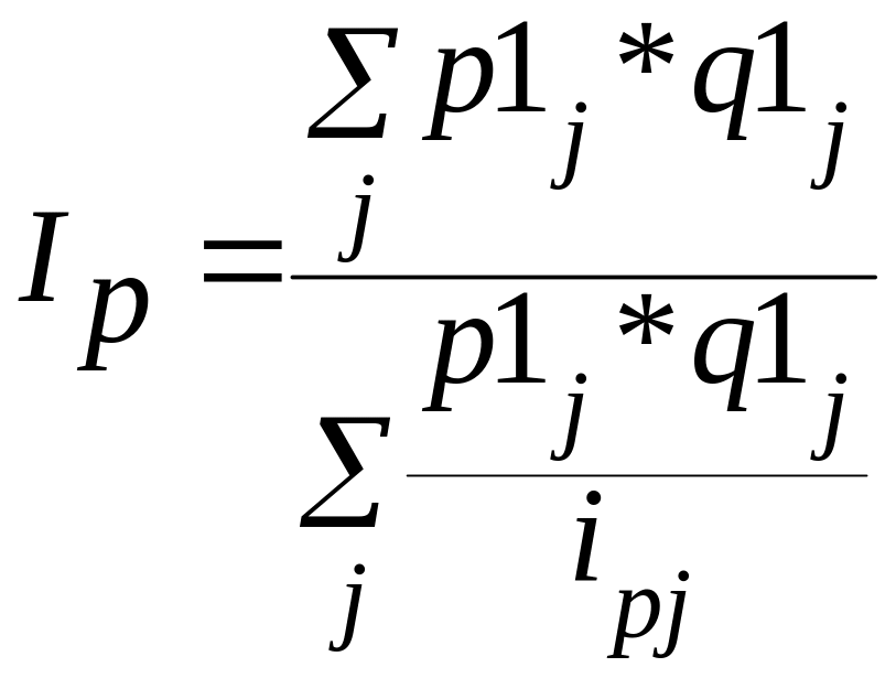 Так, если даны индивидуальные индексы цен различных видов однородной продукции (ip1, ip2,..., ipn), то агрегатный индекс цен для этого набора продукции будет определен как среднее гармоническое с весами усреднения p1j *q1j: