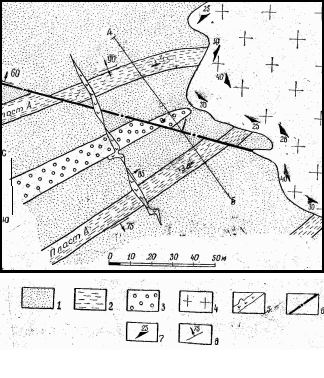 1 – конгломераты, 2 – песчаники, 3 – глинистые сланцы, 4 – известняки, 5 – свинцово-цинковые рудные тела, 6 – сланцеватость, 7 – разрывное нарушение, 8 – элементы залегания сланцеватости